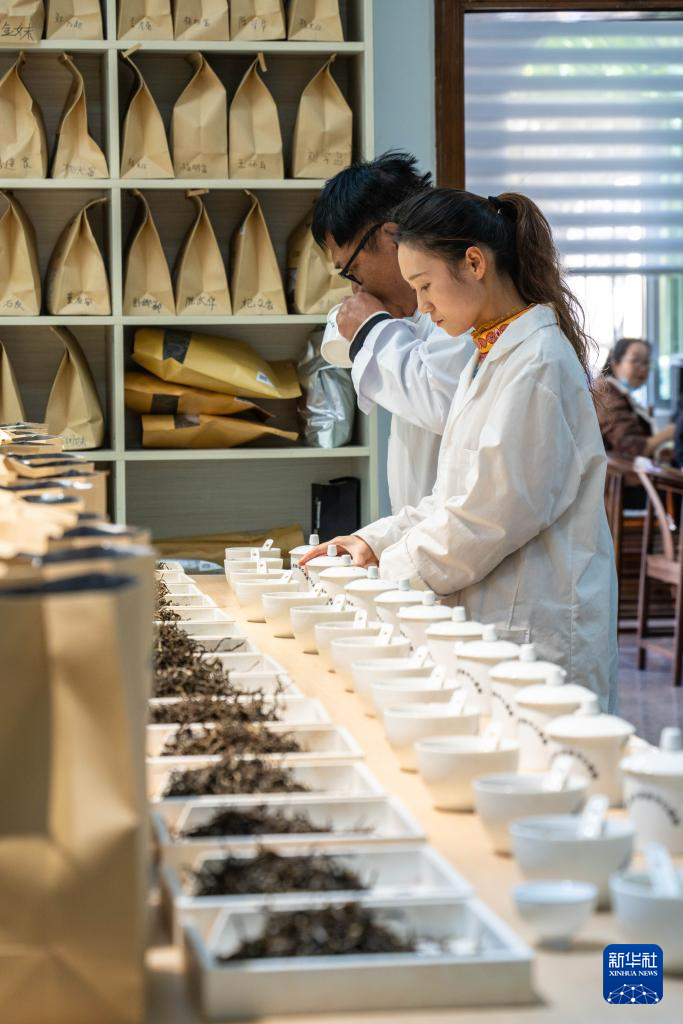 1月23日,评审专家团队在临沧市双江县茶叶检测品荐溯源中心评审茶叶。新华社记者 高咏薇 摄