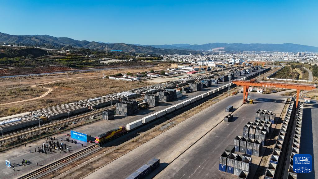 1月26日,中老铁路中亚国际货运班列在云南玉溪研和站发车(无人机照片)。新华社记者 高咏薇 摄