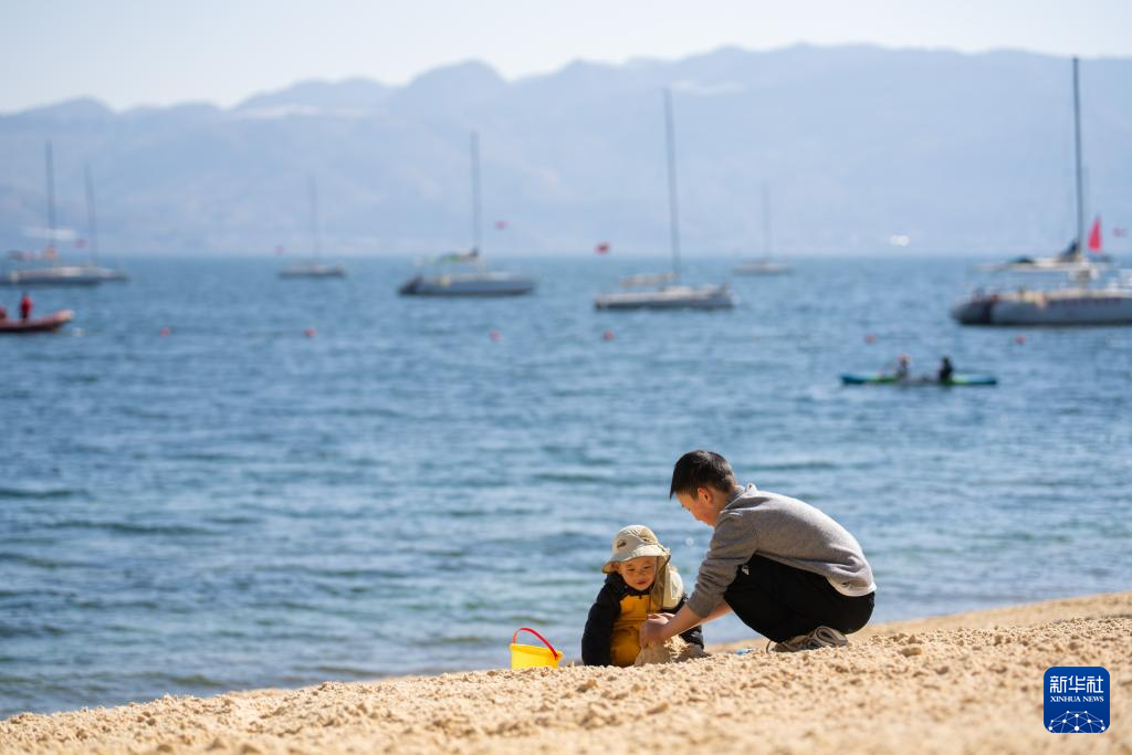 1月27日,游客在云南省玉溪市抚仙湖畔游玩。新华社记者 高咏薇 摄