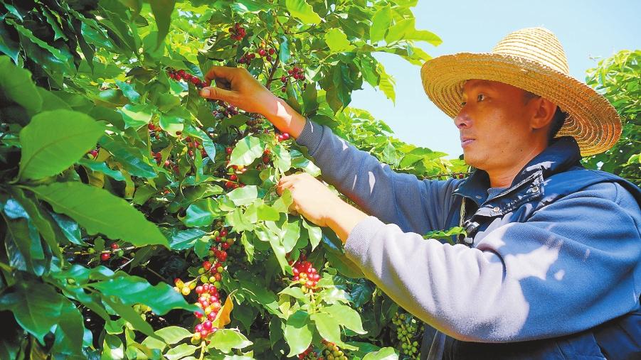 保山市隆阳区新寨村村民采摘咖啡。记者 杨艳鹏 摄