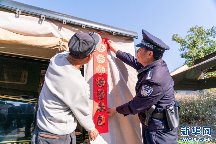 民警与房车游客一起贴春联(2月11日摄)。新华网发(谢凌宇 供图)