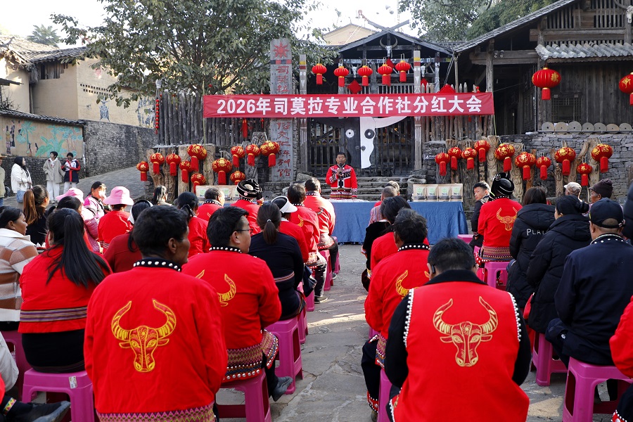 近日,在云南腾冲市清水镇三家村中寨司莫拉佤族村文化广场上,腾冲市清水司莫拉幸福佤乡旅游专业合作社的社员们欢聚一堂,举行分红大会。这是合作社自2020年成立以来的第六次分红,44.4万元现金红利,实实在在落入了社员们的口袋。