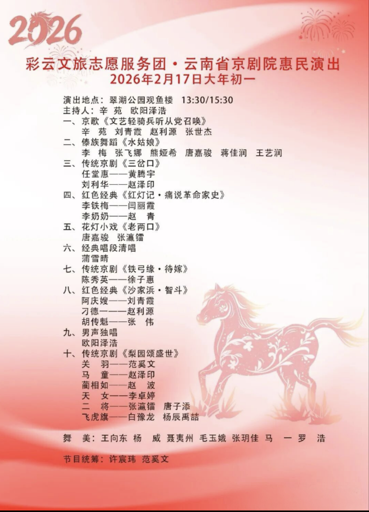 为弘扬中华优秀传统文化,丰富春节期间人民群众文化生活,推进文旅志愿服务与文化传承、民族团结、生态保护等深度融合,根据云南省文化和旅游厅有关工作要求,云南省京剧院将于2026年春节期间在昆明市翠湖公园举行“彩云文旅志愿服务团·云南省京剧院惠民演出活动”。届时,欢迎广大游客朋友们前往翠湖公园观看演出。(完)