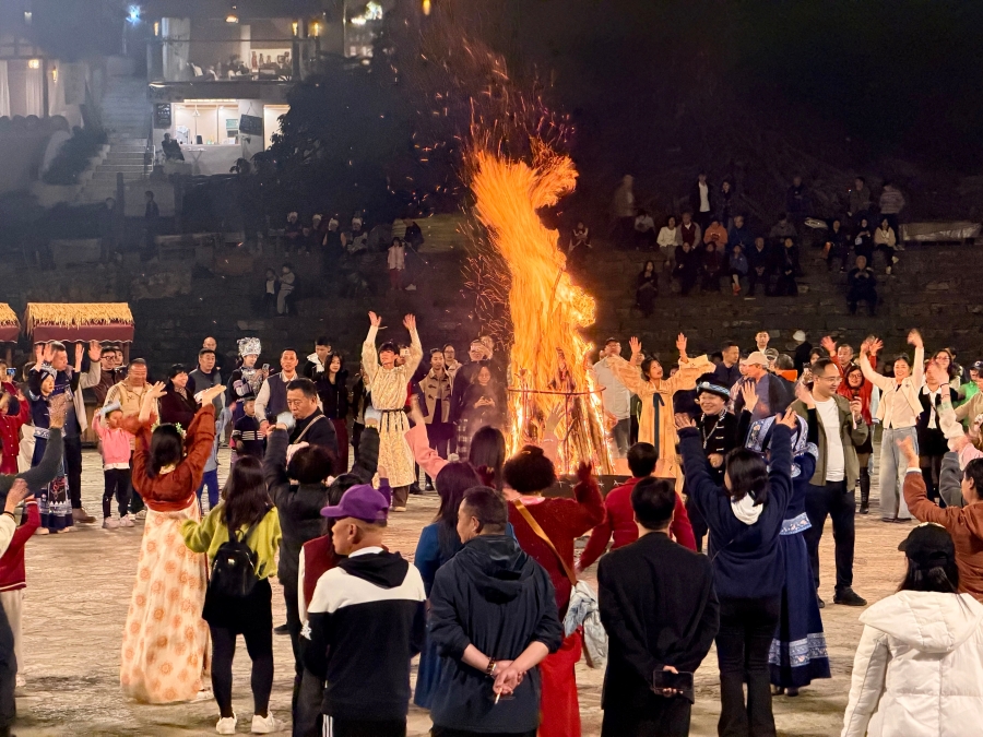 坝美世外桃源景区举行篝火晚会(2月18日摄)。