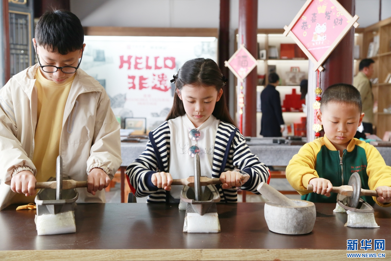 人们在云南建水古城一家非遗体验馆体验用铁药碾碾磨中药(2月18日摄)。新华网发(薛莹莹 摄)