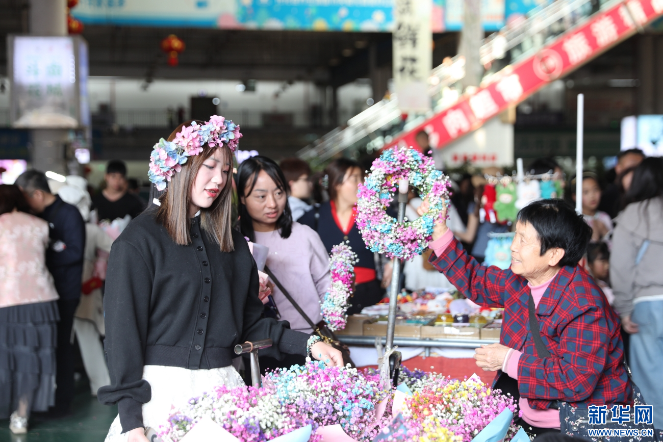 来自浙江的游客在昆明斗南花卉市场挑选试戴花环(2月22日摄)。新华网发(薛莹莹 摄)