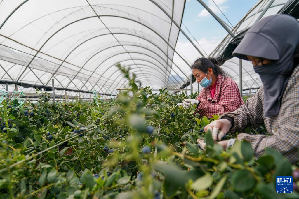 2月27日,工人在蒙自市一处蓝莓生产基地采摘蓝莓。新华社记者 彭奕凯 摄