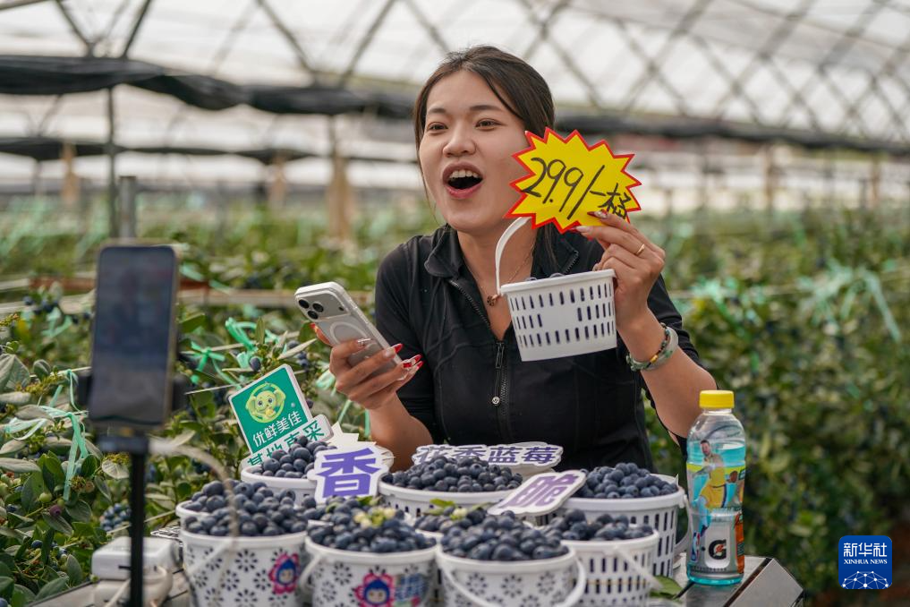 2月27日,工作人员在蒙自市一处蓝莓生产基地直播销售蓝莓。新华社记者 彭奕凯 摄
