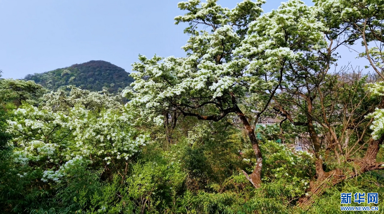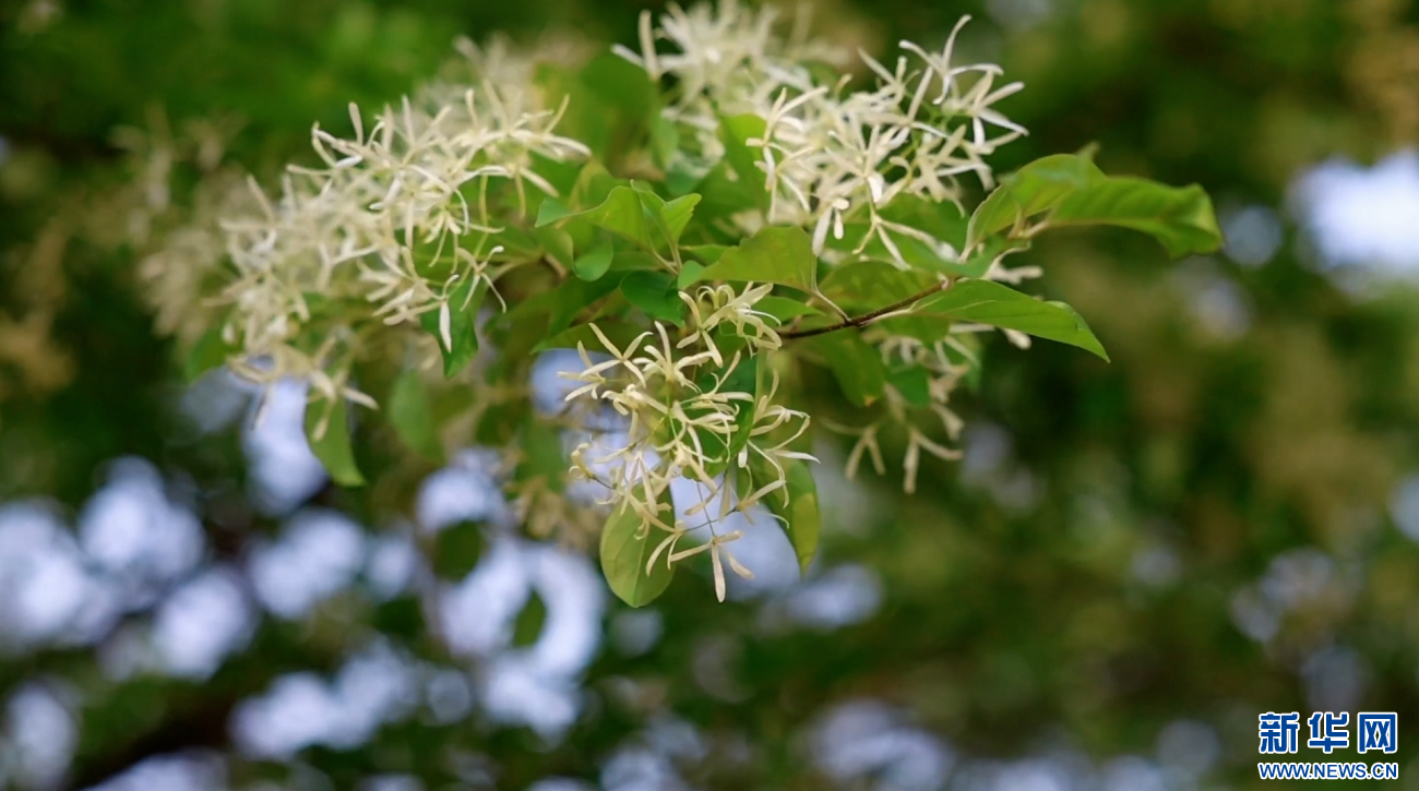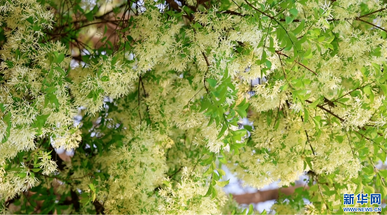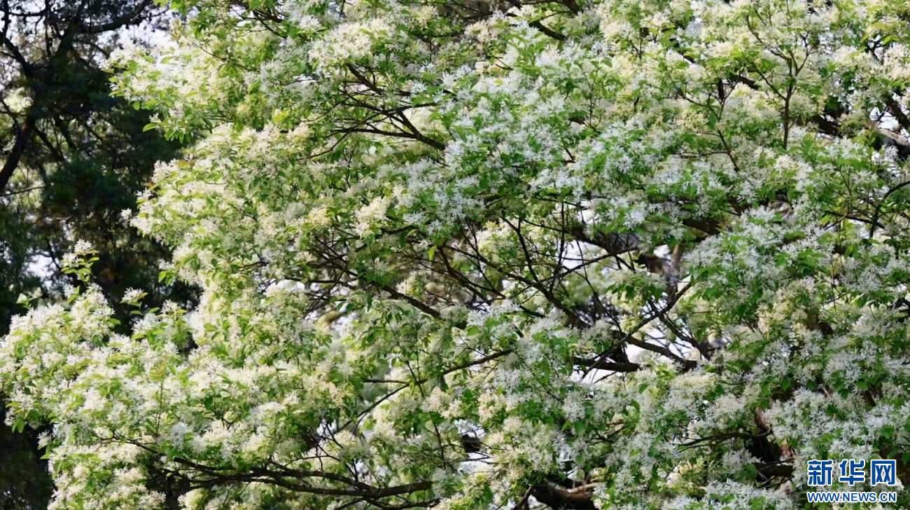 云南石林糯黑村,流苏古树冠盖如云,满树繁花悄然绽放(视频截图)。新华网发