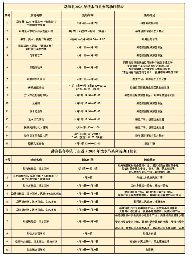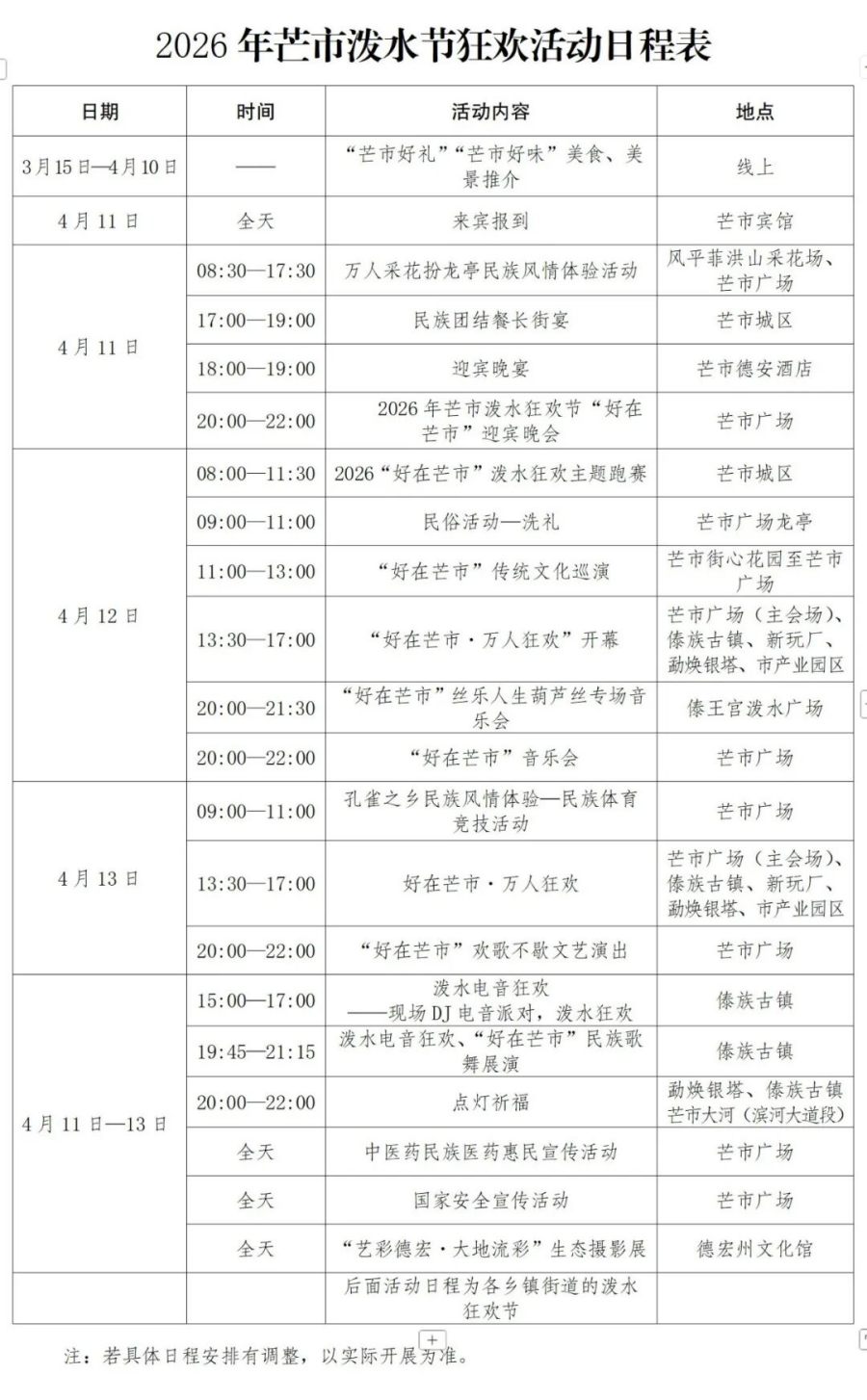 活动内容:2026年泼水节赶摆活动暨“宾弄赛嗨”联欢晚会、放火花、歌舞展演、高升颁奖仪式。