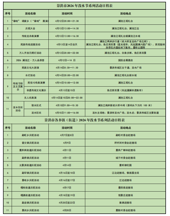 地点:景洪市龙舟广场观礼台、告庄西双景、澜沧江观礼台