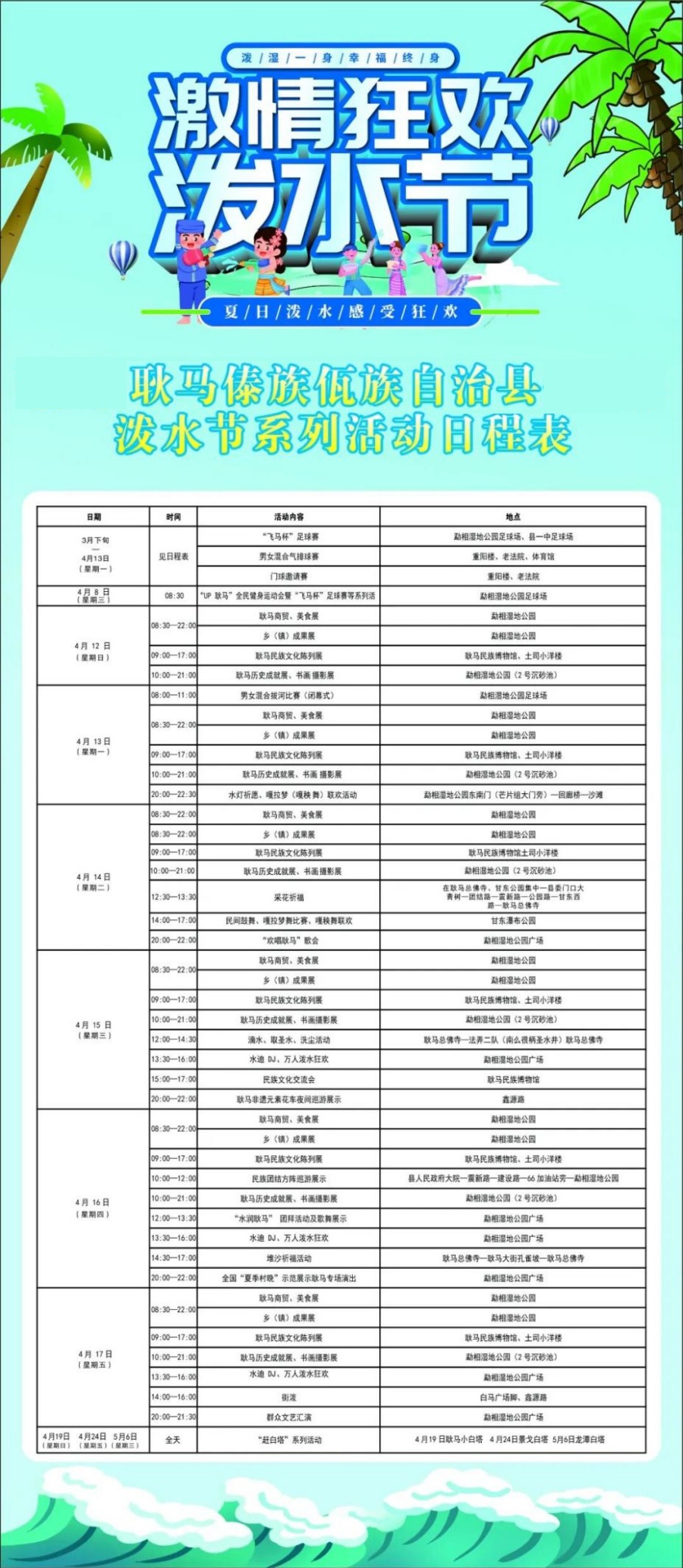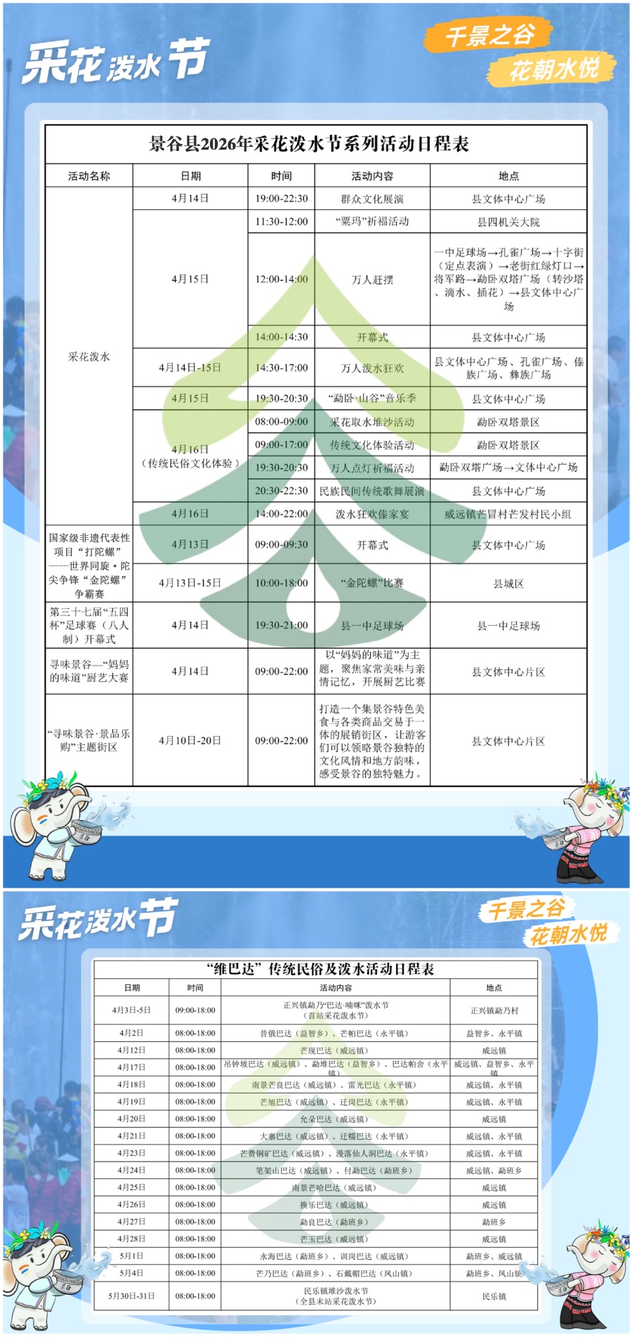 活动内容:08:00—17:30景冒溶洞寻宝活动;13:00 “宾弄赛嗨”泼水节开泼仪式(地点在景冒村农特交易中心)。