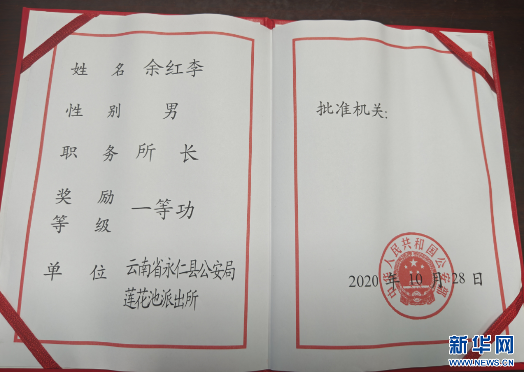 余红李生前担任派出所所长时,曾获一等功(资料图)。新华网发(云南省公安厅新闻宣传处供图)