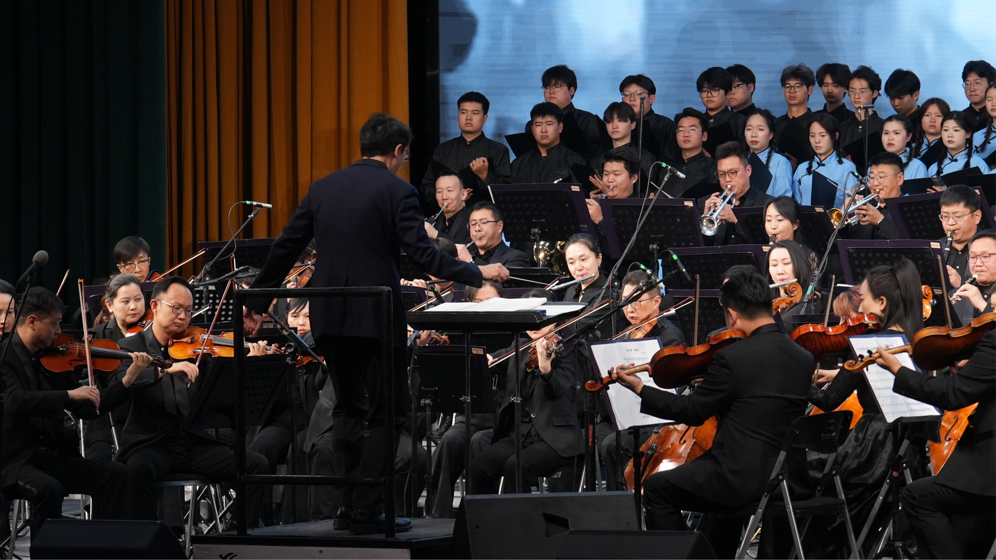 演出现场,恢宏的交响乐徐徐展开,仿佛将时光拉回那段风雨如晦却信念如磐的岁月。作为首部以西南联大为题材的原创交响乐作品,《西南联大回响》由昆明聂耳交响乐团委约作曲家刘晓耕、刘晔父子创作,历经1.0到2.0版本迭代,六次结构优化与多媒体视觉升级,艺术表达愈发成熟厚重。