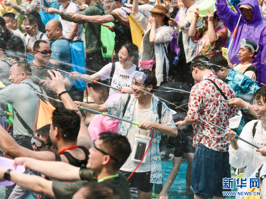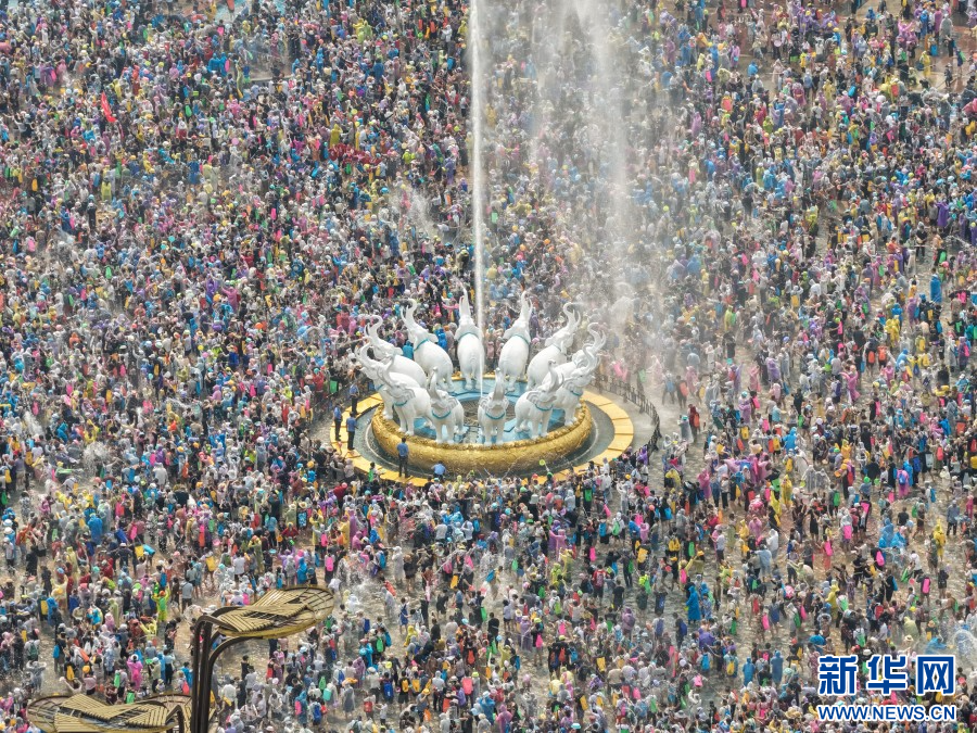 4月15日,云南省西双版纳傣族自治州万人泼水狂欢盛大启幕。市民、游客欢聚泼水广场,水花漫天飞舞,欢声此起彼伏,大家手持水盆、水枪尽情泼洒,互送祝福。(完)