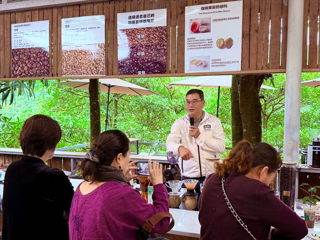 天玉庄咖啡园主理人刘晓东正在为游客讲解云南咖啡产区和风味的差异。新华社记者熊轩昂 摄