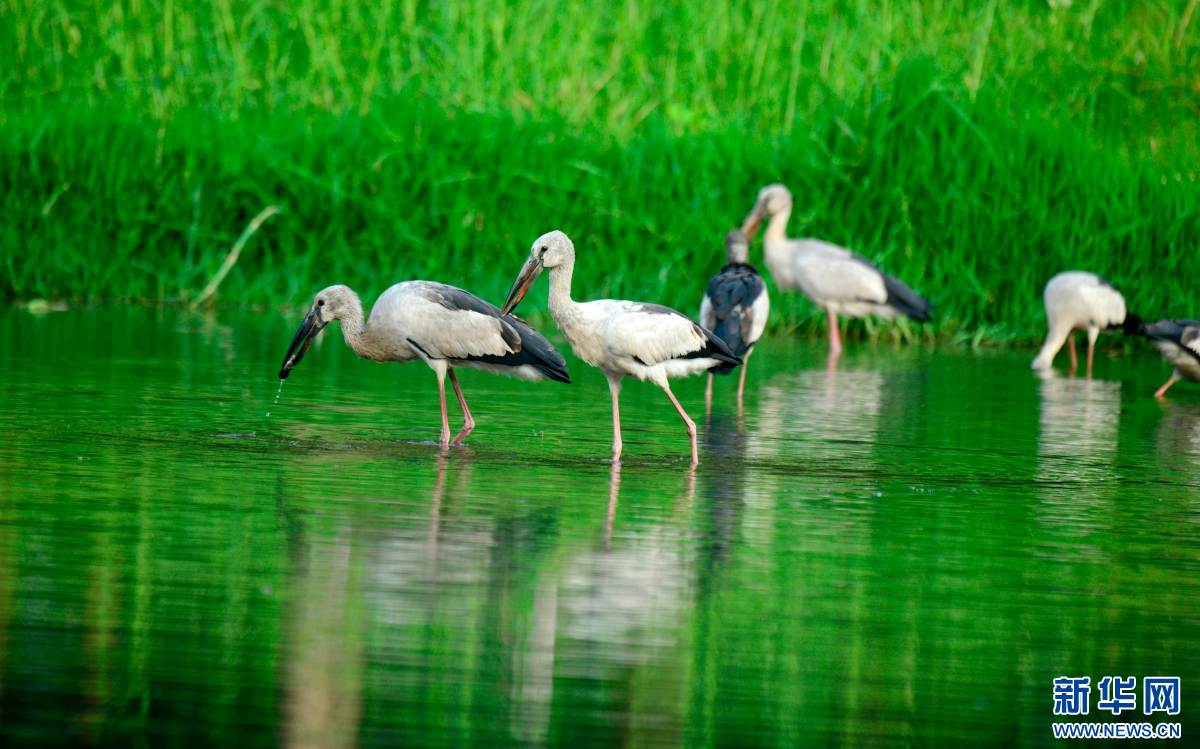 云南省红河哈尼族彝族自治州弥勒市甸溪河湿地公园,绿意盎然,满目苍翠,风光旖旎。成群钳嘴鹳前来觅食嬉戏、翩然起舞,灵动身影点缀河畔。近年来,弥勒市持续加强甸溪河生态管护,水域环境不断优化,优良的自然环境吸引众多鸟类到此栖息繁衍,绿水青山相映成趣,也让市民游客尽享生态之美。(普佳勇)