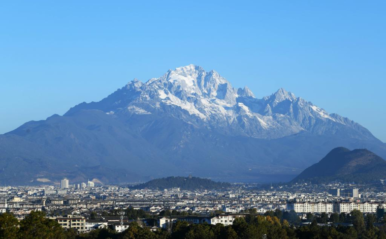 初冬时节,云南丽江玉龙雪山与山下层林互相辉映,美不胜收。