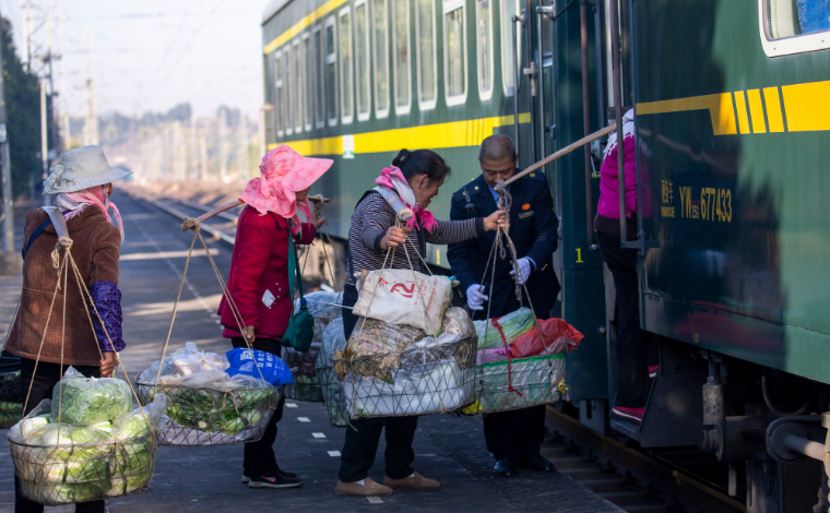 云南曲靖:春运慢火车 满满年货味